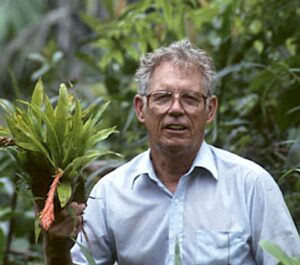 Wally was an enthusiastic supporter of the BSI. He donated many rare plants for sales and auctions that benefited the BSI, the Bromeliad Identification Center at Marie Selby Botanical Gardens, research on the “Evil Weevil”, and other worthy causes. Wally volunteered many hours of service at Selby Gardens. He had a broad knowledge of bromeliad horticulture and science and frequently spoke to bromeliad societies on a variety of topics, especially about his adventures exploring and collecting in Central and South America. Wally served in many offices in the Sarasota Bromeliad Society. he introduced several Aechmea cultivars into culture and created several hybrids, including Aechmea ‘Forest Fire’. He frequently won top awards, including Best in Show, at BSI World Bromeliad Conferences and Florida local and regional bromeliad shows. A number of bromeliad species were named in his honor.
